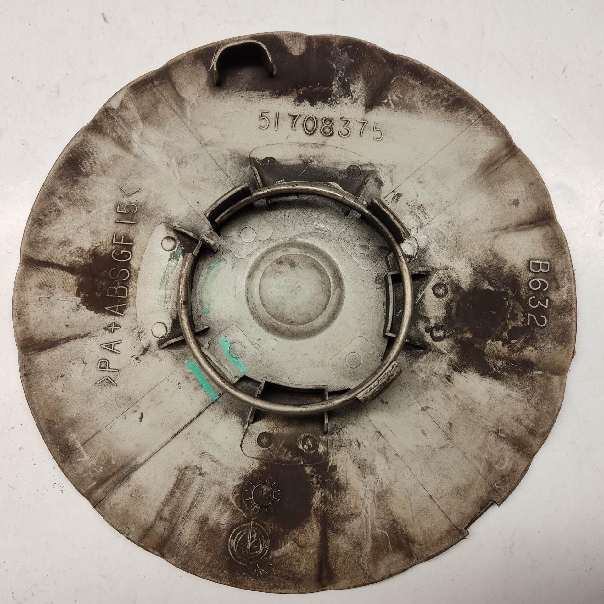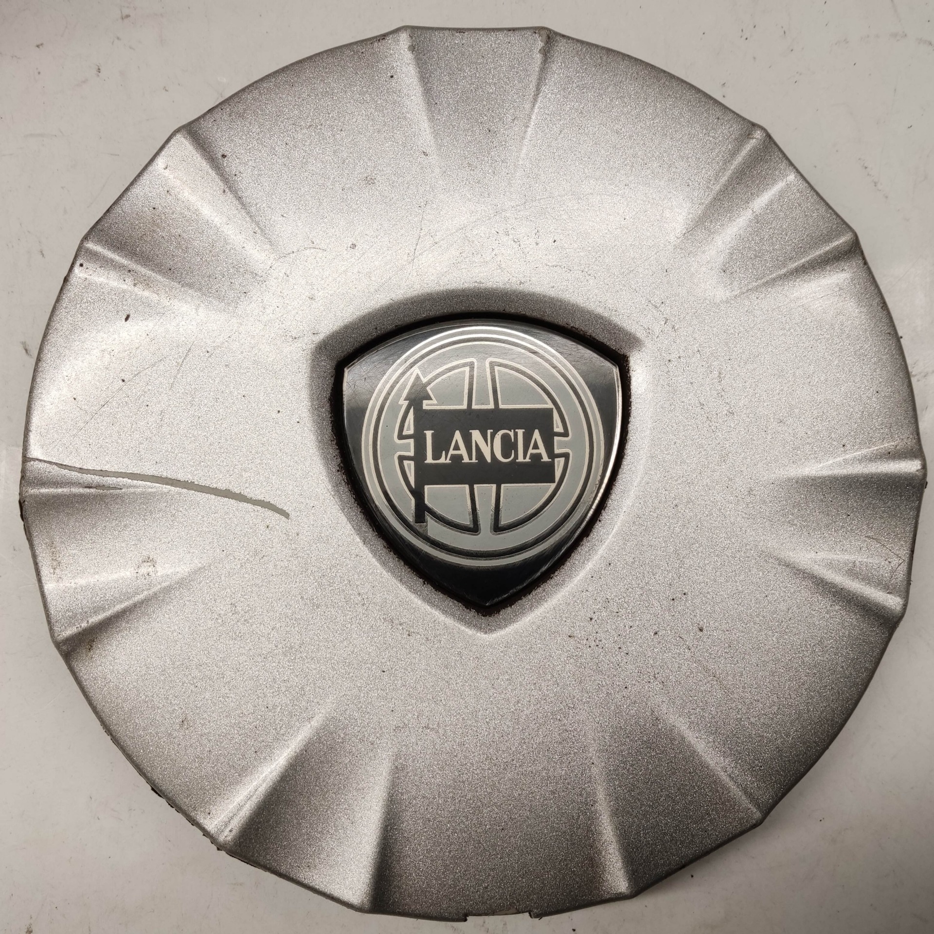 214298 Lancia Ypsilon II. 2003-2011 felni közép kupak, a képen látható állapotban, egy rögzítő fül törött, hiányzik