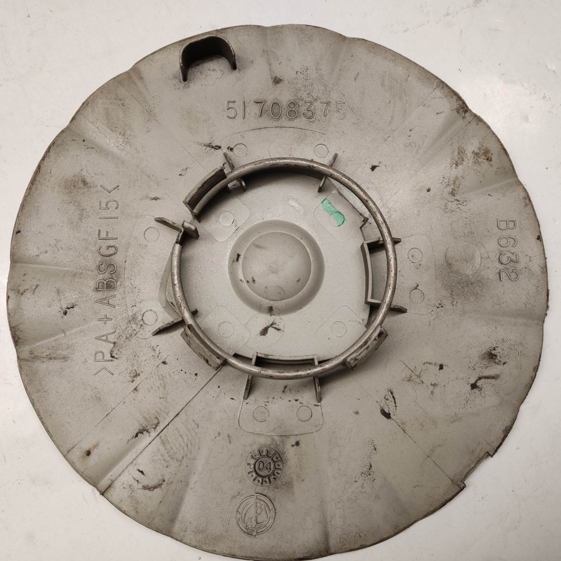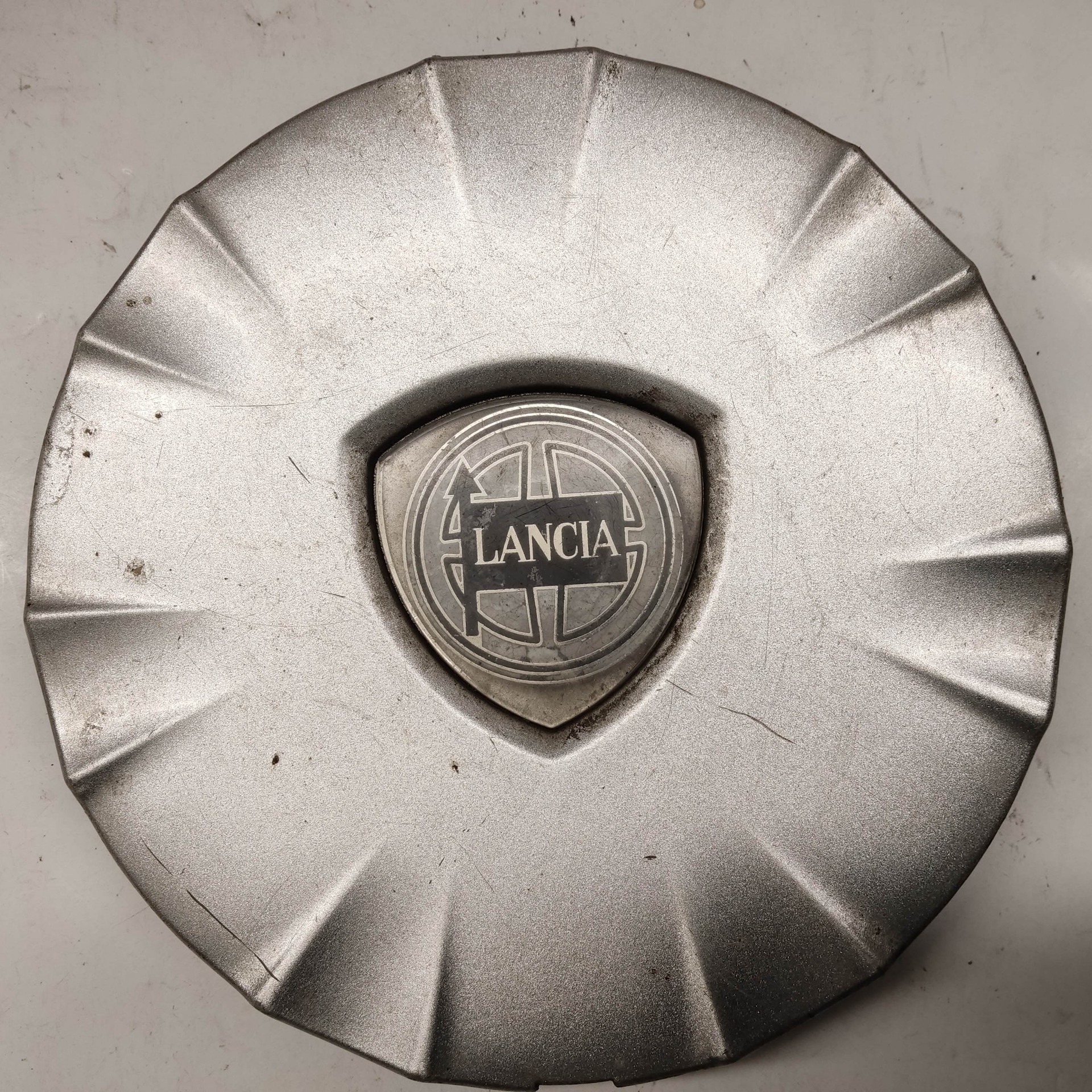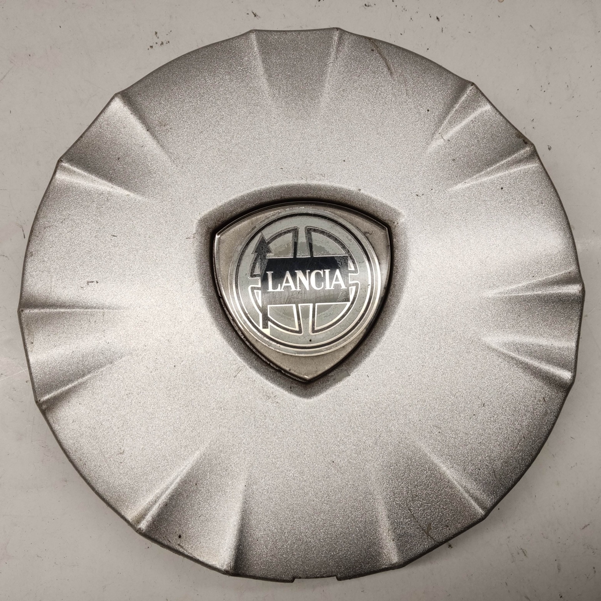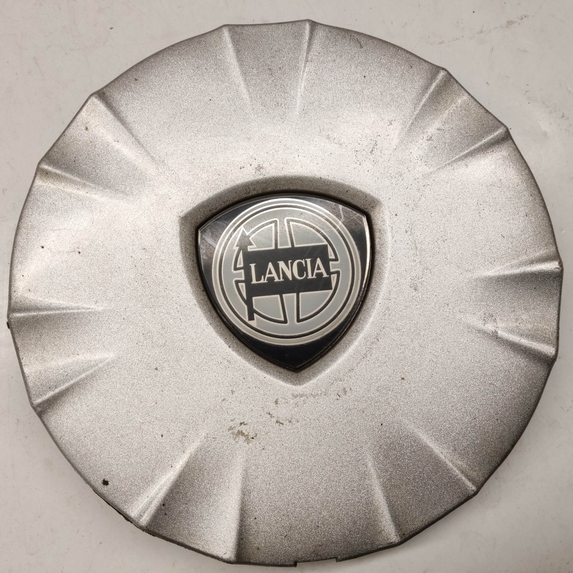 214301 Lancia Ypsilon II. 2003-2011 felni közép kupak, a képen látható állapotban, egy rögzítő fül törött, hiányzik